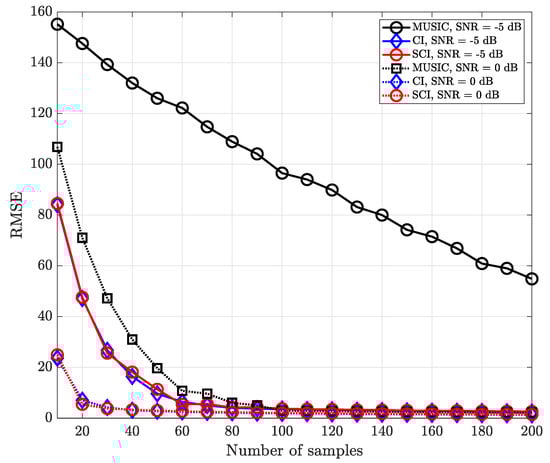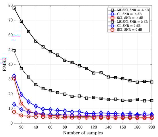 Figure 6 shows the RMSE performance versus the number of time-domain samples in a single signal-source environment for various SNR values. Basically, it is observed that the CI-based DOA estimation methods outperform the subspace-based MUSIC algorithm at low-SNR regions. Likewise, in the case of a single signal source, the performances of the CI and SCI techniques are almost the same to each other since both methods exploit sufficient time-domain samples to reduce the effect of noise.
