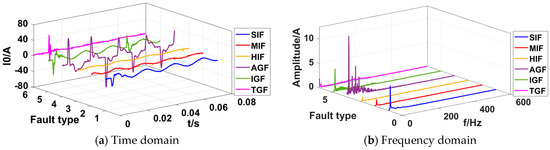The diverse types of faults make it difficult to obtain a single criterion based on the characteristics of the zero sequence current waveforms. The FFT was used to transform the waveforms to the frequency domain, as shown in Figure 3b, and it can be seen that the frequency with the largest amplitude is still the fundamental frequency. Other high-frequency harmonics have extremely low amplitudes and a relatively small proportion, and they are relatively disorderly and irregular.