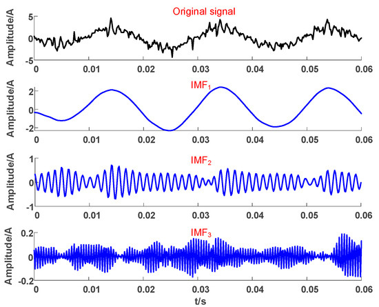 Variational mode decomposition (VMD) differs in principle from empirical mode decomposition (EMD) and its improved algorithms, effectively avoiding modal aliasing. VMD decomposes sampled signal X(t) into several intrinsic mode functions (IMFs) with central frequencies [30]. The actual transient signal frequency of grounding faults in distribution networks is approximately 300 to 1000 Hz. Based on the decomposition test of actual fault-recorder waveforms, we found that it is appropriate to divide the waveforms into three modes.