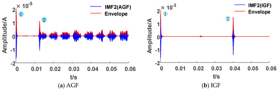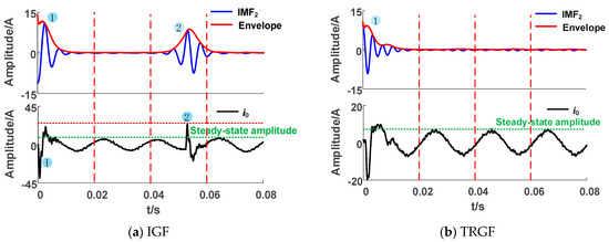When the grounding fault occurs, the transient high-frequency component changes obviously. As shown in Figure 5a, there are two transient processes in the IGF waveform. Observing the envelope of its high-frequency component IMF2, we found that there are two peaks in different periods, which can be used to identify IGFs. The high-frequency component of the transition resistance grounding fault (TRGF) in Figure 5b shows a decreasing oscillation trend, with no second peak appearing.