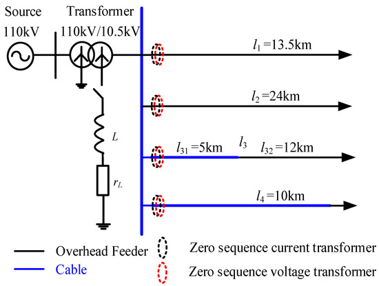 As shown in Figure 7, we established a 10 kV radial distribution network model in the electromagnetic transient simulation software. It consists of four feeders, among which feeder l1 and l2 are overhead lines, feeder l3 includes a cable and overhead line, and feeder l4 is a cable. The parameters of the overhead line and cable are shown in Table 1 [32].