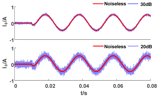 In practical applications, due to the presence of various disturbances, the quality of the received signal will decrease [33,34,35,36]. In order to simulate the noise that often occurs in practical engineering applications, Gaussian white noise is usually superimposed on the original ZSC signal. As shown in Figure 12, after adding Gaussian white noise, the waveform is distorted. With the decrease in the signal-to-noise ratio (SNR), the distortion degree of the zero sequence current waveform superimposed with 20 dB noise (compared to SNR = 30 dB) is higher.