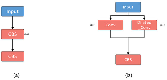 Figure 5. Schematics of dilated convolution addition. (a) CBS layer of original YOLOv5s; (b) CBS layer of modified YOLOv5s with dilated convolution.