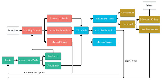 The detection result output of the improved YOLOv5s target detection algorithm was used as the input to the DeepSort algorithm, and the algorithm is illustrated in Figure 8. The detailed structure of the DeepSort algorithm is shown in Figure 9.