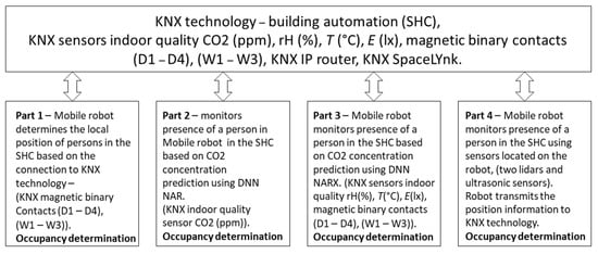 - Part 3. The AMR indirectly monitors (without camera) the presence of a person in a room ahead of time based on the prediction of the CO2 concentration waveform in advance using the measured KNX operational technical variables such as indoor temperature, indoor relative humidity, indoor light intensity, window opening/closing information (W1, W2, and W3), and door opening/closing information (D1, D2, D3, and D4) using the NARX neural network and subsequent transmission of the information to the AMR.
