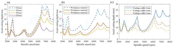 The SLDs for different tool overhang lengths, workpiece materials and cutting widths. (a) Different tool overhang lengths, (b) Different workpiece materials, (c) Different cutting widths.