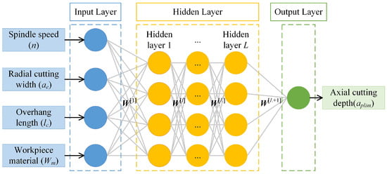 The artificial neural network has been widely used in predicting the milling stability and can achieve an acceptable prediction accuracy [30,31]. Then, the multilayer perceptron is used to predict the limiting axial cutting depth. The MLP is a feedforward artificial neural network consisting of the input layer, hidden layers, and the output layer. The topological structure of an MLP containing L hidden layers is shown in Figure 3, where W[l] is the weight vector connecting the (i − 1)th and (l-th) layers, l = 1, 2,…, L + 1. Each layer has one or more neurons, and the neurons in two adjacent layers are fully connected. Then, the input of the (j-th) neuron in the lth layer is the weighted sum of the outputs of all neurons in the (i − 1)th layer.