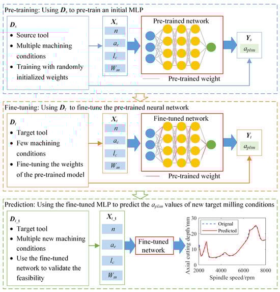 A concise description of transfer learning in predicting the milling stability under different combinations of a tool and workpiece is provided in Figure 4. First, different overhang lengths of the source tool are selected to conduct the impact tests at the tool tip and obtain the FRFs. The workpieces with different materials are determined, and the source tool is adopted to perform several milling tests on each workpiece. Then, the cutting force coefficients for these workpieces are identified and combined with the obtained tool tip FRFs to compute the limiting axial cutting depths through the theoretical milling stability analysis. With the sufficient source data Ds composed of the machining parameters, tool overhang length, codes of the workpiece materials and limiting axial cutting depths, an MLP is trained to predict the aplim values of the source tool. For the target tool, reduced tool overhang lengths and workpiece materials are defined to perform the impact tests and milling tests. The obtained tool tip FRFs and cutting force coefficients are utilized to construct the target data Dt. The structural parameters of the pretrained source MLP are transferred to the target domain, and the target data are utilized to update the weights through the selected finetuning strategy. Ultimately, a new MLP is trained to predict the milling stability of the target tool for different combinations of overhang length and workpiece material.