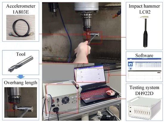 The tool tip dynamics can reflect the structural dynamics characteristics of the machining system and are commonly represented by the tool tip frequency response functions (FRFs) in the frequency domain [7]. Generally, the tool tip FRFs are acquired through impact testing, finite element simulations, substructure coupling methods and so on [8,9,10,11]. Kolar et al. [12] proposed a coupled method to establish the whole machine tool system by joining the spindle and machine frame finite element (FE) model. It is convenient to establish the FE model of a new tool; however, its related joint dynamics are difficult to simulate accurately. Due to some simplifications in constructing the finite element model, the frequency response function obtained by the finite element simulations still have some obvious deviations from the actual values. Wang [13] introduced the receptance coupling substructure analysis (RCSA) method to utilize the tested FRFs at the end of the spindle to predict the tip FRFs of different tool–holder assemblies. However, the accuracy of RCSA is subject to many parameters that are difficult to measure or identify. For example, the joint dynamics of the tool–holder–spindle assembly are difficult to measure and susceptible to the complex contact conditions, limiting the ability to accurately identify the joint stiffness and damping coefficients. Therefore, impact testing has become the most acceptable approach to obtain the tool tip dynamics; this is where the forces exerted at the tool tip are measured and combined with the vibration signals recorded by the pasted sensors to directly generate the tool tip FRFs. Chang et al. [14] utilized impact testing to obtain the FRFs of the tool–spindle system and predicted the SLD using the full discretization method for selecting the appropriate chatter-free machining parameters. Since the tool tip FRFs are mainly determined by the dynamic characteristics of the tool–holder assembly, the tool properties, including the tool materials, tool diameter and tool overhang length, can significantly affect the tool tip FRFs. Once one of the mentioned tool properties is changed, repeated experiments, simulations or identifications are required to update the tool tip FRFs, and the shutdown of the machine tool for a long time will decrease the production efficiency. Therefore, though many effective methods have been proposed to improve the accuracy of tool tip FRFs, their efficient evaluation under different tool–holder assemblies remains a challenge.