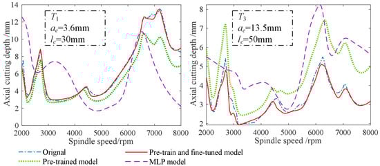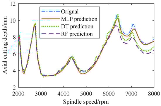 In addition, three SLDs plotted by the MLP, DT, and RF models, respectively, were compared in Figure 6. When n > 6300 rpm, the aplim values predicted by the DT and RF models showed obvious deviations from the original ones, while the aplim values predicted by the MLP model still fit the original ones well. Therefore, the MLP was selected to construct the pretraining model for predicting the milling stability under the multiple machining conditions of the source tool.