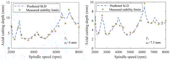 For the target tool T1, the MAPE, RMSE and R2 values on the 18,150 testing samples were 0.056, 0.892 and 0.987. For the target tool T3, the MAPE, RMSE and R2 values on the 18,150 testing samples were 0.062, 0.631 and 0.987. Although the MAPE, RMSE and R2 values were a little far away from their ideal values of 0, 0 and 1, they still reflected an acceptable prediction accuracy of the pretraining and finetuning-based milling stability prediction model when only four tool overhang lengths and two types of workpiece materials were used to construct the target data. The MAPE, RMSE and R2 values for the other two models are also shown in Table 7. It can be seen that under the working conditions of the two target tools, the MAPE and RMSE values of the proposed pretraining and finetuning-based model were much smaller than those of the other two models, and the R2 values were closer to 1 and much higher than those of the two other models. This comparison validates that the proposed method can benefit the building of the stability prediction model when the number of tool overhang lengths and workpiece materials are decreased. In addition, the SLDs plotted using different prediction models are described in Figure 7, where the aplim values predicted by the proposed method were more consistent with the actual ones calculated through the theoretical milling stability analysis, further indicating the feasibility of the proposed method in training a stability prediction model with fewer tool overhang lengths and workpiece materials. Some experimental stability limits detected from the chatter tests are provided in Figure 8. The curve tendencies of the theoretical SLDs were close to the real conditions, but differences between the predicted and detected stability limits were still observed for some simplifications of the used analytical milling stability model. In the future, we will further extend this proposed method to obtain feedback from few experimental stability limits and improve the prediction accuracy under limited impact tests and chatter experiments.
