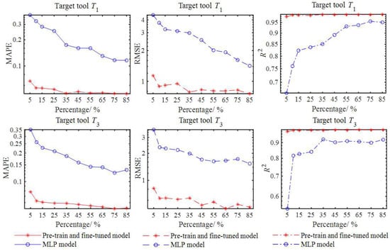 In transfer learning, the number of target training samples has a direct impact on the performance of the prediction model [33]. Therefore, different training sample sizes were determined for a comparison and study of their effects on the target milling stability prediction model. The 150 combinations of ae, lc and Wm in the source domain were taken as the basis to determine the target training sample sizes. Within the percentage variation range from 5% to 85%, the number of {ae, lc, Wm} combinations for the target domain varied from 150 × 0.05 = 8 to 150 × 0.85 = 128. For each target tool, the Latin hypercube sampling method was repeatedly used to sample the combinations of ae, lc and Wm within their variation ranges in Table 3. For each combination, 61 pairs of n and aplim were calculated within the range of 2000 rpm to 8000 rpm at an interval of 100 rpm. Therefore, the size of the finally obtained training samples for each target tool varied from 61 × 8 = 488 to 61 × 128 = 7808. Multiple MLPs were constructed through the proposed pretraining and finetuning-based method, and the testing data Dt_T1t and Dt_T3t obtained in Section 3.1 were still taken to verify the feasibility of the constructed MLPs. The MPAE, RMSE and R2 values corresponding to different training sample sizes are plotted in Figure 8. The target training samples of T1 and T3 were also used to directly train the MLPs for comparisons, and the same testing data Dt_T1t and Dt_T3t were used to evaluate the corresponding MLPs by calculating the MPAE, RMSE and R2 values as shown in Figure 9.