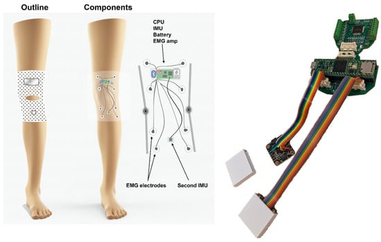 (Left) Device overview. The goal of the KAM system is to continuously measure the knee angle over prolonged periods (e.g., 24 h) using light and non-obstructive sensors. Therefore, two miniature IMUs were placed above and below the knee. In addition, the muscle activity of the knee and ankle muscles was measured by an onboard EMG amplifier/digitalizer module. (Right) The KAM device hardware. The modularity of the system is provided by the ability of the PCB to be broken into several pieces, one for the microcontroller and connectors, one for the EMG amplifier, and two belonging to IMU boards. This way it is possible to integrate it into the garment in an optimal way, or for example, by removing the EMG part if it is not necessary for a specific study/patient.