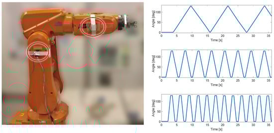 Test setup with ABB IRB120 robot. Two IMU sensors were placed in two segments of the robot (circled in red). In the repeated test, the IMU on the right was rotated by 10° by the actuator to simulate misalignment between two sensors. Three linear angular velocities were produced by the robot, 22°/s, 75°/s, and 150°/s.