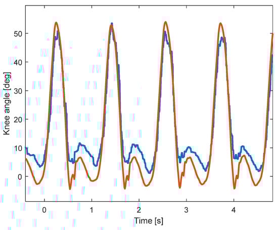 Sample signals during walking at 4 km/h. The knee angle measured by the motion-tracking system (red) is smoother and has a larger range of motion than the knee angle measured by the KAM system (blue).
