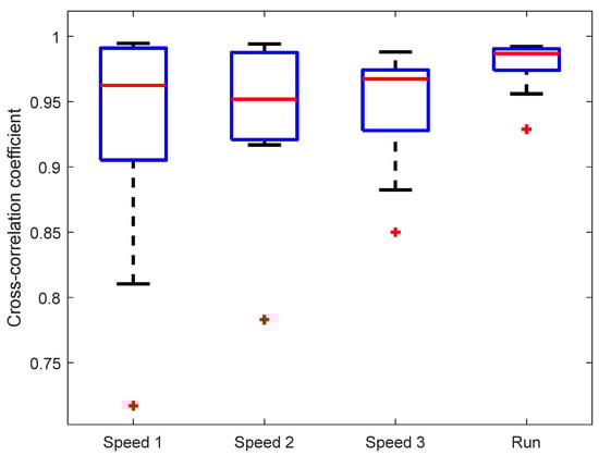 The observed similarity of knee angle shapes was confirmed by the cross-correlation between KAM and the “gold standard“ (motion-tracking system), see Figure 5. The mean cross-correlation coefficient of all subjects was above 0.95 for each of the walking/running speeds. There was no statistically significant difference between cross-correlations at different walking/running speeds. It is interesting that the cross-correlation coefficient is highest and the variability lowest for the running speed (7 km/h), indicating a good dynamic range of IMU sensors that are able to capture the signal shape during rapid movements.