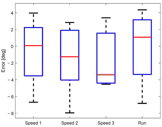 The sample-to-sample error of the measured knee angle for all subjects is shown in Figure 6. The mean sample-to-sample error of all subjects was below 4°, while in the most extreme cases, it went to 8°. A multiple comparison test did not find any statistically significant differences between the sample-to-sample error for different walking/running speeds, confirming that the accuracy of the knee angle estimation does not depend on the walking conditions.