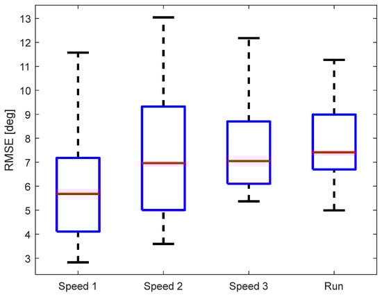 As another evaluation metric of the KAM device, we calculated the root-mean-square error (RMSE) between KAM and the “gold standard“. The data were analyzed per walking/running speed, see Figure 7. The median RMSE of all subjects was below 8° regardless of the speed of walking/running. A multiple comparison test did not find any statistically significant differences between the RMSE for different walking/running speeds. Although the RMSE variability between different participants was lowest for running, the median RMSE was highest (though, not statistically significant).