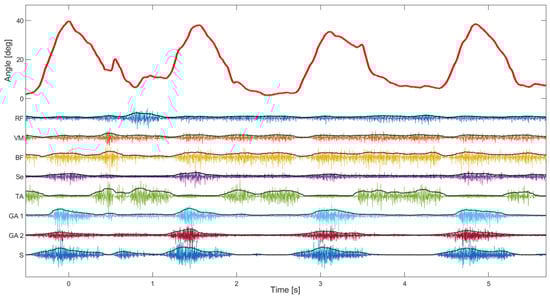Knee angle and 8 channels of EMG during slow walking. The angle (red signal) was shown during four consecutive steps. On the same plot are superimposed EMG channels and their envelopes (RF—Rectus femoris, VM—Vastus medialis, BF—Biceps femoris, Se—Semitendinosus, TA—Tibialis anterior, GA—Gastrocnemius, and S—Soleus).