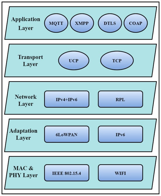 The network layer, also called data transmission, is responsible for receiving and transferring industrial information between physical objects, smart things, devices, sensors, networks, and servers using a wired or wireless medium []. It consists of protocols like IPv4, IPv6, WiFI, ZigBee, etc., and helps the connection between the perception (or sensor) layer. As a result, the network layer is susceptible to various attacks. Man-in-the-middle attacks (MITM), Sybil attacks, spoofing, denial of service (DoS), and sinkhole attacks are the riskiest and most well-known attacks on the network layer [].
