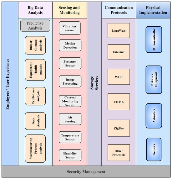 Big data analysis collects essential and useful information from massive data and various types of data. The increasing deployment of sensors and IoT devices has resulted in a big data source in the IIoT. In IIoT systems, big data analytics is utilized for both functional and customer data. The big data-based IIoT network platform is shown in Figure 5. It is divided into six parts: big data analysis, employee experience, storage devices, monitoring and sensing, communication protocols, and physical implementation. This platform allows users to connect to the IoT backbone and collect data on equipment’s health monitoring, indoor climate, miniaturization, manufacturing process automation, etc. [].