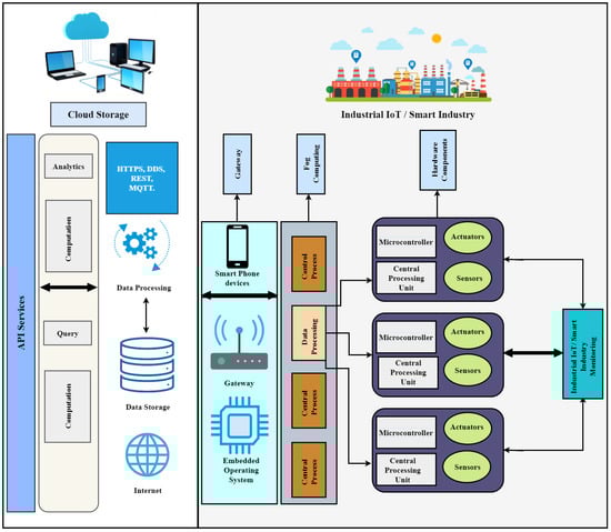 Cloud computing delivers a huge amount of storage via large virtualized computers linked together. In addition, cloud computing and big data consist of the latest high-performance computing, IIoT technologies, service-oriented technologies, and cloud services []. Figure 6 shows the cloud computing-based IIoT network platform with four layers: cloud storage, gateway, fog computing, and hardware modules. The IIoT-related data, including manufacturing processes, indoor climate change, moisturizing, and smart industry marketing, are stored in the cloud. The networked infrastructure provides on-demand resources. In addition, online services and analytical resources are also stored and accessed via cloud computing [].