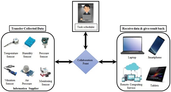 Connecting a large number of devices to the internet for data sharing is not appropriate or safe. Instead, local gateways are designed to solve data-sharing problems by connecting all hardware devices and sensors for security, connectivity, and controllability. For example, a gateway in a production process or productivity unit controls a real-time manufacturing monitoring system and enhances automation. Similarly, fog computing allows the distribution of hardware components, cloud services, and the combination of available resources []. In addition, fog computing ensures real-time processing and reduces cloud computational load. The main objective of fog computing is to take advantage of both edge and cloud computing to maximize cloud computing resources and on-demand scalability.