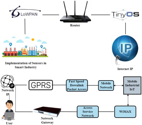 Similarly, Figure 9 shows an interconnected network comprising internet protocol (IP), GSM, WiMAX, access service network gateway, and manufacturing units. A wireless sensor network is used to monitor (the manufacturing process) and control (power consumption) in many fields of the smart industry. ZigBee is used in network topology; the function of ZigBee is to transfer data or sensitive information through routers, sensors, base stations, and end devices. In addition, sensors like air sensors, temperature sensors, vibration sensors, humidity sensors, current monitoring sensors, and microcontrollers are used []. The router and microcontroller are connected directly to the end devices, and the microcontroller communicates with the base station through the serial port to examine the collected data. According to software monitoring, each end device is configured properly, and attached sensors are enabled. When the sensors are turned on, each device follows the router to connect in the designed way. End devices can connect to the WSN using the same key after validation. Sensor data are sent to the base station, which analyzes the information. Data are transferred through ZigBee to the controller or router when end-device sensors are read. The bidirectional communication via ZigBee is the main strength of this network topology.