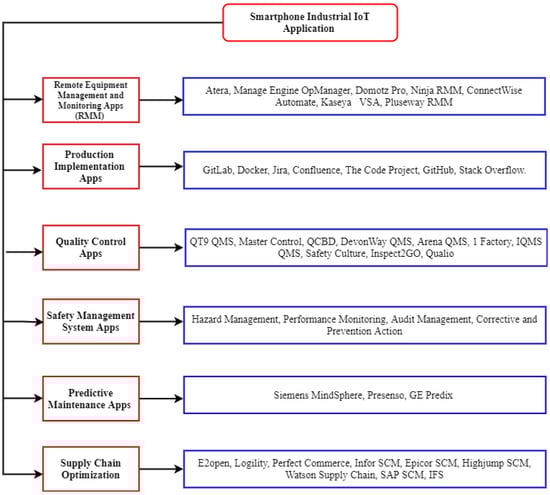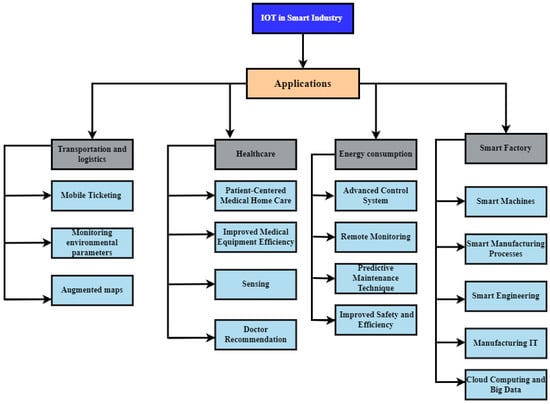 The IIoT system is used as an order in many fields, such as smart factories, healthcare, energy consumption, transportation, logistics, etc. There are three types of industrial applications: IIoT applications, sensor-based applications, and smartphone-based applications. The classification of IIoT-based applications is presented in Figure 10, which was created to examine the industry’s current IoT solutions.