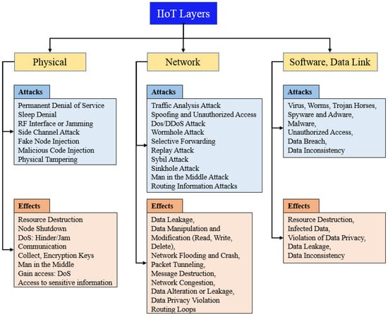 The work illustrated in [,] explains the IIoT framework taxonomies to help researchers discover the security, network, and technology gaps but misses the security threats and their existing solutions. The current study briefly discusses attack taxonomies and their solutions. IIoT security research can significantly impact the industrial security process. Strong bonding between security and safety in IIoT is identified by []. Similarly, Ref. [] propose a security solution and identify the security challenges in IIoT but lack taxonomy attacks and their solutions.
