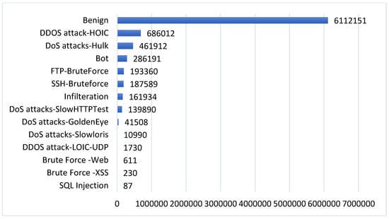 This work relies on a public intrusion detection dataset, namely CSE-CIC-IDS 2018, which was created by The Canadian Institute for Cybersecurity (CIC) and the Communications Security Establishment (CSE) [24]. This dataset is synthesized to generate similar traffic to the real network traffic. It was generated by using the AWS computing platform to simulate the topology of a common LAN network. It contains 14 distinct attacks. These 14 classes and their distribution are shown in Figure 1.