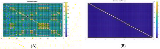 Dimensionality reduction: data normalization involves scaling down the data to be in the same range as the firing function, between 0 and 1 [26]. In the CSE-CIC-IDS2018 dataset, features are distinctive in their statistical properties, such as mean and standard deviation. Consequently, dimensionality reduction is implemented to bring all features into the same statistical range. The dimensionality reduction has been applied using the principal component analysis (PCA). In addition, PCA is also applied to eliminate the correlation and map the data into a low-dimensional space, where each feature is mapped into a PCA space, providing the most important information. Initially, we trained the model before applying dimensionality reduction, but the training accuracy could not exceed 70%. After a deep investigation of the dataset, we applied dimensionality reduction using principal component analysis. After applying PCA, the dataset size was reduced dramatically. The dataset had only 32 retained columns and 45 highly correlated features, which are considered redundant and have a minor contribution to the classification process. The original data in 2D, before applying PCA, are shown in Figure 2A, whereas the correlated data after applying PCA in 2D are shown in Figure 2B. PCA was applied to the dataset using the build-in layer in MATLAB, which defined the correlation of the data by calculating the eigenvector and eigenvalue of the covariance matrix. Then, the function was finding the major component by sorting these components by their eigenvalue in decreasing order.