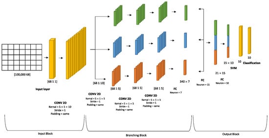 The proposed architecture for the deep learning system comprises an input layer, a series of hidden layers, and an output layer. The architectural structure is divided into three distinct blocks, namely the input block, which consists of the input layer and the general convolutional layer; the second block, which consists of three parallel branches that employ stacked convolutional layers followed by a fully connected layer to extract features; and the third block, which has two completely connected layers, namely the SoftMax layer and the classification layers, which are responsible for decision-making. In each block, a series of layers are present, whereby the convolution layers are responsible for feature extraction. The primary purpose of the pooling layer is to extract salient characteristics from the input data and effectively reduce its dimensionality. Nevertheless, the pooling layer may lead to the loss of important information within the data. For this, we employed a convolutional layer with a stride value of one to decrease the dimensionality of the feature instead of using the pooling layer [28]. In the process of feature extraction, the rectified linear unit (ReLU) activation function is utilized to activate every neuron inside the output of the network. The rectified linear unit (ReLU) is widely employed as an activation function to introduce nonlinearity into the system. The activation function layer serves as a crucial component within convolutional neural networks (CNNs), responsible for converting the input into a significant and interpretable representation of the data. However, to mitigate computational complexity and introduce parallelism to the data, the suggested architecture is partitioned into three parallel branches. Furthermore, the combination of several convolutional neural networks (CNNs) results in improved classification accuracy compared to individual CNNs [29]. This is because deep learning fusion has several benefits over traditional machine learning techniques. First, it can combine multiple data sources to create a more accurate and comprehensive understanding of data. This allows for more accurate predictions and better classification. Additionally, deep learning fusion can process large amounts of data quickly and efficiently, making it ideal for applications that require real-time analysis [30]. However, the three blocks of the proposed model will be discussed in detail in the following subsections. The proposed topology is shown in Figure 3.
