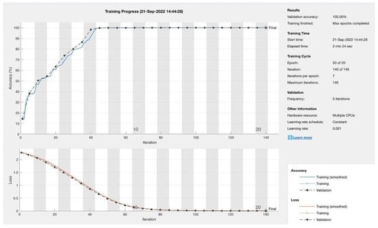 Data splitting: data splitting is frequently used in deep learning to separate data into train, test, and validation sets. The training dataset is a collection of instances that are used to fit the model’s parameters. The validation dataset is part of the dataset used to fit the model’s hyperparameters. The testing dataset is a part of the dataset used to evaluate the proposed model and detect the biasing on the network. The dataset splitting ratio used in this study is 50% for training, 20% for validation, and 30% for testing; this splitting ratio is one of the common splitting used in the literature [27]. The data splitting has been implemented in the MATLAB code where 50% of the dataset is taken as the training set, 20% is taken as the validation set and 30% is taken as the testing set. According to this splitting, each set of the dataset is used in different phases in training, validation and testing.