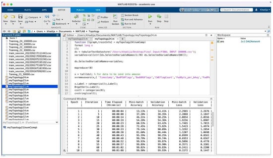 Once the preprocessing approaches have been applied, the dataset is subsequently fed into the proposed model for training. Table 2 presents comprehensive information for the 15 training experiments that were carried out. The first round of experiments focused on 30 features extracted using PCA, which were treated as an independent feature called PCA space. This round consisted of three experiments. In the subsequent rounds, the number of features was expanded to 40, 50, 60, and finally 68. For each one of these feature numbers, experiments were conducted three times. Subsequently, the CNN model was enhanced by adding a support vector machine (SVM) layer, and subsequently, five experiments were conducted on 100,000 instances. Similarly, for model classification, there were five experiments conducted with different features ranging from 30 to 68 features, with 10 feature increments for each experiment. These experiments are carried out on a personal computer using the hardware and software characteristics listed in Table 3. The practical implementation was executed using MATLAB version R2022b, where the performance of the proposed deep learning model is assessed through the utilization of a confusion matrix. The training parameters utilized for optimizing weights and biases are associated with the Adam optimizer. The training parameters are presented in Table 4. However, developing and training the proposed model has some challenges. The first challenge is that training the model requires high computational resources. The second challenge is that applying the preprocessing technique and obtaining a high training accuracy takes a lot of trial and time. This challenge results in limitations, where the system is only tested on the CSE-CIC-IDS2018 dataset and has not been tested on another dataset. This limitation will be considered, and the system will be tested on another dataset in future work. The training and validation phase is shown in Figure 5, and part of the code with the training details is shown in Figure 6. Part of the preprocessing work is shown in Figure 7.