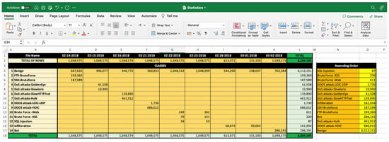 Down-sampling: in CSE-CIC-IDS2018, there are four classes with few instances, as shown in Figure 1. These four classes have less than 2000 instances, whereas the rest have more than 10,000 instances. To keep the balance between these classes, all classes with less than 10,000 instances have been removed. The four classes that were removed are SQL Injection, Brute Force-XSS, Brute Force-Web, and DDOS attack-LOIC-UDP. Therefore, this work considers ten classes, including nine attacks and benign traffic. Initially, the dataset had 17% attack traffic and 83% benign traffic. The down-sampling technique is applied to minimize the chance of overfitting and high bias on the network. For this, only 10,000 instances from each class are randomly chosen. Thus, the total number of instances for all classes will be 100,000, where the classes are completely balanced. These ten classes are: Benign, DDOS attack-HOIC, DoS attack-HULK, Bot, FTP-BruteForce, SSH-BruteForce, Infiltration, DoS attack-SlowHTTPTest, DoS attack-GoldenEye and DoS attack-Slowlorie. The down-sampling was implemented manually in the Excel file with the help of the filter feature.