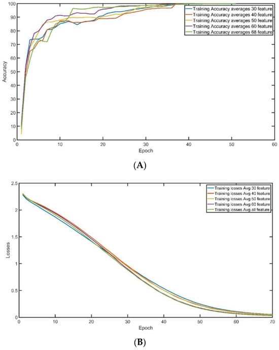 The convergence of training accuracy is demonstrated in Figure 8A, which displays the average of three experiments conducted on the same dataset with 100,000 records and several features used for training. The accuracy of training surpasses 95% after 35 epochs, and the stability of training is generally excellent, regardless of the number of features employed. However, when all the features are chosen for training, there is a slight improvement in the convergence rate. Figure 8B exhibits the convergence of training loss during the training epoch, with each curve representing the average of three experiments run on the same data setting (100,000 records and a fixed number of features used for training). The training loss drops to less than 0.5% after 45 epochs, and the stability of training loss is generally good, regardless of the number of features used. However, there is a slight decrease in the loss convergence rate when 60 or all features are selected for training.