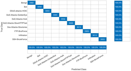 The accuracy of the proposed model when applied to 100,000 records using 30, 40, 50, 60, and 68 features is the same. Therefore, we have only presented the confusion matrix for the 68 features in Figure 10. Table 5 provides a detailed analysis of the accuracy of the confusion matrix for 100,000 records with 68 features. This study found that the proposed model performed well when applied to the CSE-CIC-IDS2018 dataset using 68 features and 100,000 records in all ten classes, including benign, bot, DDoS attack-HOIC, DoS Attack-GoldenEye, DoS Attack-Hulk, DoS Attack-SlowHTTPTest, DoS Attack-Slowlories, FTP-BruteForce, infiltration, and SSH-BruteForce. The accuracy, true-positive recall, precision, specificity, false-positive recall, and F-score for all classes were 100%, 100%, 100%, 100%, 0%, and 100%, respectively. Mainly, obtained 100% accuracy after applying the data preprocessing technique to the chosen synthesis dataset. The data preprocessing techniques had a major effect on our accuracy, where the accuracy before applying data preprocessing did not exceed 70% and the accuracy after applying data preprocessing reached 100%. This clarifies the reason that some studies produced varied results by applying the same model on the same synthesis dataset. This is because each researcher applies different data preprocessing techniques based on the researcher’s investigation of the chosen dataset. In other words, in this study, the accuracy did not exceed 70% before applying dimensionality reduction, whereas the accuracy reached 100% after removing the correlation and the duplication of the dataset using principal component analysis (PCA). In addition, the preprocessing techniques of the synthesis dataset depend on the researched investigation of the dataset. In other words, the preprocessing techniques applied to the synthesis dataset affect the accuracy result, and this preprocessing technique depends on the researcher’s investigation of the dataset itself. For example, in [32], we can see that the accuracy of using the same model on the same dataset after applying different preprocessing techniques is different. The reason is that the preprocessing techniques applied to the dataset affect the result even if the same model is applied to the same dataset. In addition, the main concept of overfitting is that the model is unable to produce good prediction results on the new data, whereas the proposed model was able to produce 100% accuracy on the new dataset. This provides evidence that the proposed model is not overfitted because it has high prediction capability on the new data. The consistent accuracy across different feature sets and the achievement of 100% accuracy after data preprocessing highlight the robustness of our model. While this performance pertains to the CSE-CIC-IDS2018 dataset, it is important to recognize that results may vary when applying the model to different datasets; this is a consideration we intend to address in our future work, further enhancing the model’s real-world applicability and generalizability. Additionally, the 0% false-positive recall signifies a low risk of false alarms, an essential factor for intrusion detection system reliability.