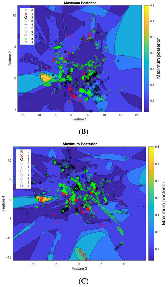 Figure 11B shows the projection of the data on Feature 1 and Feature 2 in dimensionality. It shows the regions created by SVM projection in two dimensions. These regions are divided into contours to classify the classes. The contours in the figure distribute the probabilities of the maximum posterior, which range from 0.2 to 0.8, as shown on the right side. The colors in the figure represent the probability range and divide the regions into different probabilities to determine the various classes. Additionally, the figure illustrates that there is interference between the classes because it represents ten dimensions in a two-dimensional projection. However, combining the contour image in Figure 11B with the 100 scattered images in Figure 11A reveals that projecting data in different dimensions can help identify one or two classes. Figure 11A contains 100 images, each representing the projection of different features for each face of the 10 dimensions. Figure 11C demonstrates the projection of the data onto Feature 3 and Feature 4 in two dimensions.