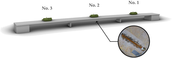 The measured strains were caused by a recovery tank placed in the middle of each span as static load. Figure 3 gives a view of the bridge from below and illustrates the applied measurement devices and their position as well as the static loading on position nos. 1–3.