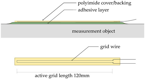 Subsequent to the development of foil-type strain gages in the 1950s, foil-type strain gages have become the standard sensor in the electric strain measurement [18]. The mechanical changes of strain on the concrete surface are transferred to the included electrical conductor, changing its electrical resistance according to its alteration of length [18]. The foil-type strain gage itself is composed of a backing from polyimide, a constantan wire-grid, and a thin cover [18]. A schematic description of the different constituent parts of a foil-type strain gage is given in Figure 4. For the application on concrete surfaces, grid lengths of at least 120 mm and the implementation of only two conductors in the foil have proven to be a convenient choice [18]. However, the application on large structures requires the application of quarter bridges and leaves no chance for calibrating the measurement chain on-site.