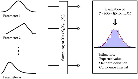 Figure 5 gives an illustration of the basic methodology of uncertainty propagation using the Monte Carlo methodology. After the process of sampling an input vector from the different components of uncertainty, the physical relation is exploited to simulate the indirect measurement for varying inputs. The obtained output sample is then evaluated according to its measures of central tendency and dispersion (mean value and standard deviation). From a more metrological point of few, GUM [10] describes the procedure as follows: