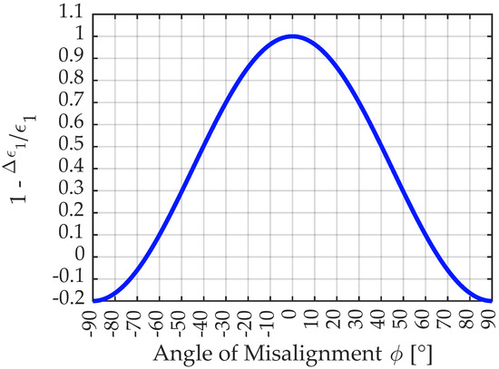 As transverse sensitivity is zero and the stress state is uniaxial, the recording of strain is always smaller than the actual value when the gage is misaligned, which can be interpreted as a decline of the k-factor according to Equation (14) from [18]. Figure 7 shows the ratio between the measured value and the actual strain depending on the angle of misalignment as it is also used in Equation (14). As the graph is symmetric to , each misalignment of the strain gage, no matter what the direction of the misalignment is, leads to a decrease in the evaluated strain and thus biased results. For the necessity on the correction of this systematic uncertainty component, please refer to Section 3.3.3.