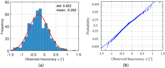 (a) Histogram of the evaluated angle of misalignment from a sample of size 500; (b) normal probability plot of the observed inaccuracy from misalignment.