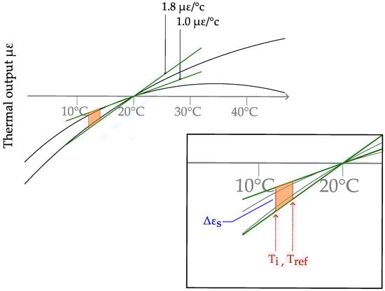 As the cases of application normally do not meet the test specification in [20] and due to the sensitivity of the gage factor to changes in temperature, an additional component of uncertainty needs to be respected. The addition in sensitivity is linear to the difference in temperature and can be expressed according to Equation (12), which has been taken from [18].