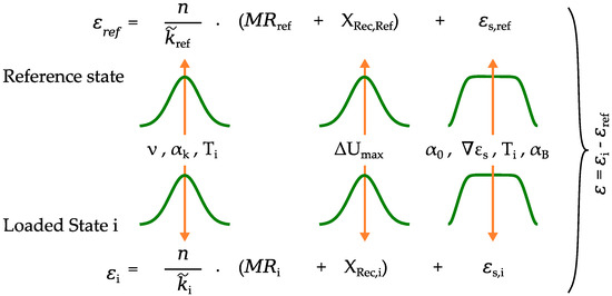 The transfer of the difference in voltage to an attributed strain value, as part of the data acquisition system, is studied as well as the different influences of temperature on the measurement reading in the absence of mechanical strain, e.g., due to scatter in the thermal characteristics of the measurement object and the sensor. Contributions from misalignment are examined in Section 3.3 using an experimental study for the specific use case. Error arising from the adhesive layer between the concrete surface and the strain gage is not considered in the context of this paper. Instead, it is quantified as a blunder. Measurement readings biased by bonding failure may be detected by an outlier test and discarded or respected in a different manner.