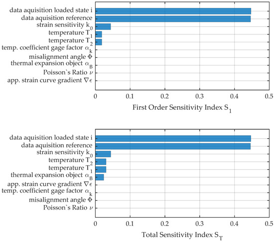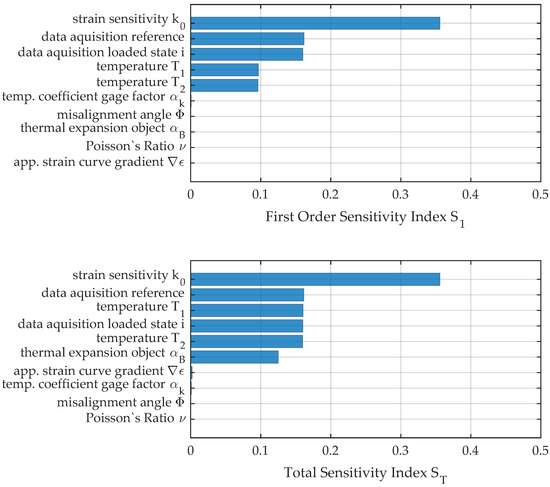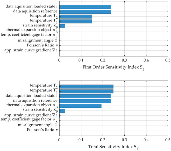 The results in Figure 13 for the first load position and at a moderate temperature difference between the reference state of only 0.0515 K show that the sensitivity estimators of first order and the total indices approximately match and reveal a high influence of the data acquisition system in this stage of the test series. The resulting uncertainty can mainly be traced to the nonlinear behavior of the voltage measurement. The sensitivity measures for temperature uncertainty are increased approximately by a factor of 1.5 but are still of minor influence. A more significant increase from the two measures of sensitivity can be seen for the importance of the thermal expansion coefficient . The increase by a factor of approximately can be attributed to the interaction with temperature uncertainty in the model function of Section 4.