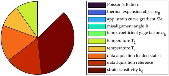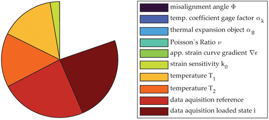 Due to the significantly higher strain for position no. 2, the deviation of the strain sensitivity is of major importance while the influence of the data acquisition system has shrunk. Instead, the interaction effect from temperature prevails that would not have been seen if only sensitivity analysis or uncertainty propagation of first order was conducted. The increased temperature range of 0.195 K considered for the evaluation results in a significant influence of temperature and uncertainty in the thermal expansion of the measurement object. The considerable influence of the nonlinearity of the functional relationship and the importance for consideration in uncertainty evaluation can be seen in the pie chart in Figure 15. Only about 87% of the uncertainty can be explained by pure deviation of single factors, while 13% is attributed to interaction terms.