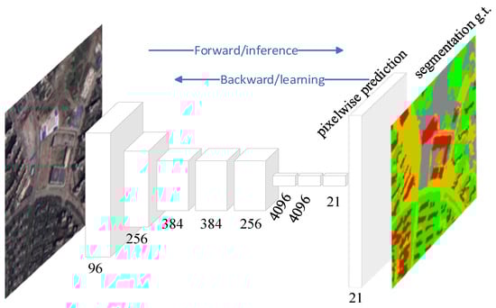 Fully convolutional neural networks (FCNs) belong to a special variant of CNNs and are mainly used for image semantic segmentation. Unlike CNN, it does not contain fully connected layers, but replaces fully connected layers with fully convolutional layers. Some FCNs also contain some local perceptual layers, e.g., transposed convolutional layers, upsampling layers, etc. Unlike traditional CNN-based semantic segmentation methods that take image chunks as input, FCN samples a more direct approach, instead taking the entire image as input and manually labeling the graph as output. This end-to-end training approach greatly improves the computational efficiency of the network as well as more accurate segmentation results, making FCN stand out in semantic segmentation tasks. FCN can be a favorable tool for LULC classification because it not only provides pixel-level prediction, it also captures the spatial information in remote sensing images well in order to achieve multi-scale feature learning and other advantages, so as to achieve efficient and accurate classification [31,32]. Figure 6 shows an illustration of FCN, where an input image of arbitrary size is first subjected to feature extraction through multiple convolutional and pooling layers in which the feature map resolution is gradually reduced while higher semantic features are obtained. Secondly, pixel level segmentation prediction is generated by transposed convolutional layer operations to restore the image resolution to the input state. Finally, the image is outputted.