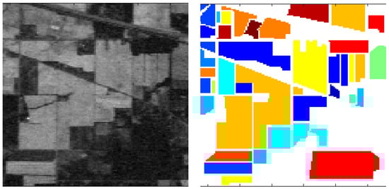 Figure 7. Schematic diagram of the Indian Pines. - Pavia University [34] was published in 2015, and the image was captured by a ROSIS sensor with a size of 610 × 340 pixels. There are nine different land cover classes, including pasture, bare soil, grassland, etc., containing a total of 103 spectral bands. A ratio of 80:20 or 70:30 is usually chosen to divide the training and test sets to evaluate the algorithms (Figure 8).